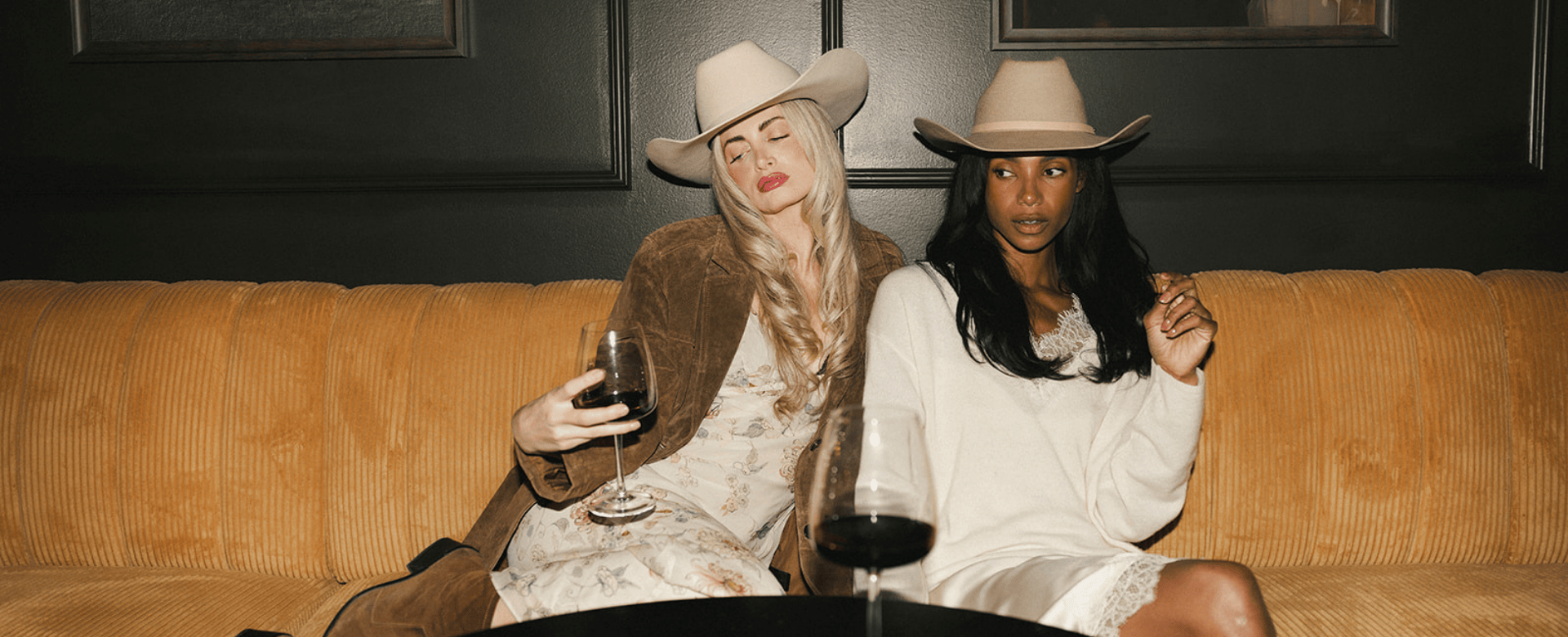 Woman wearing a beige cowboy hat against a black background