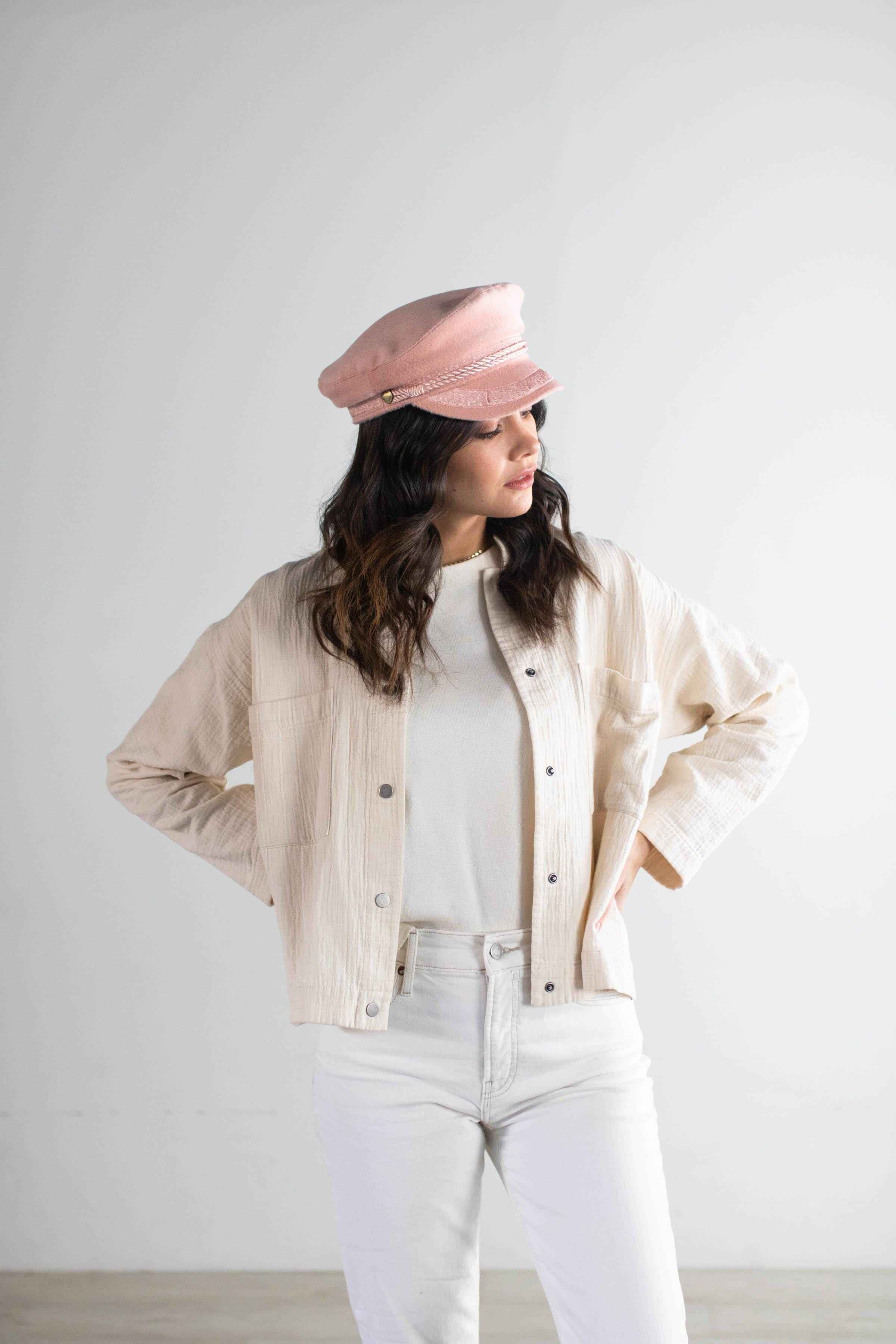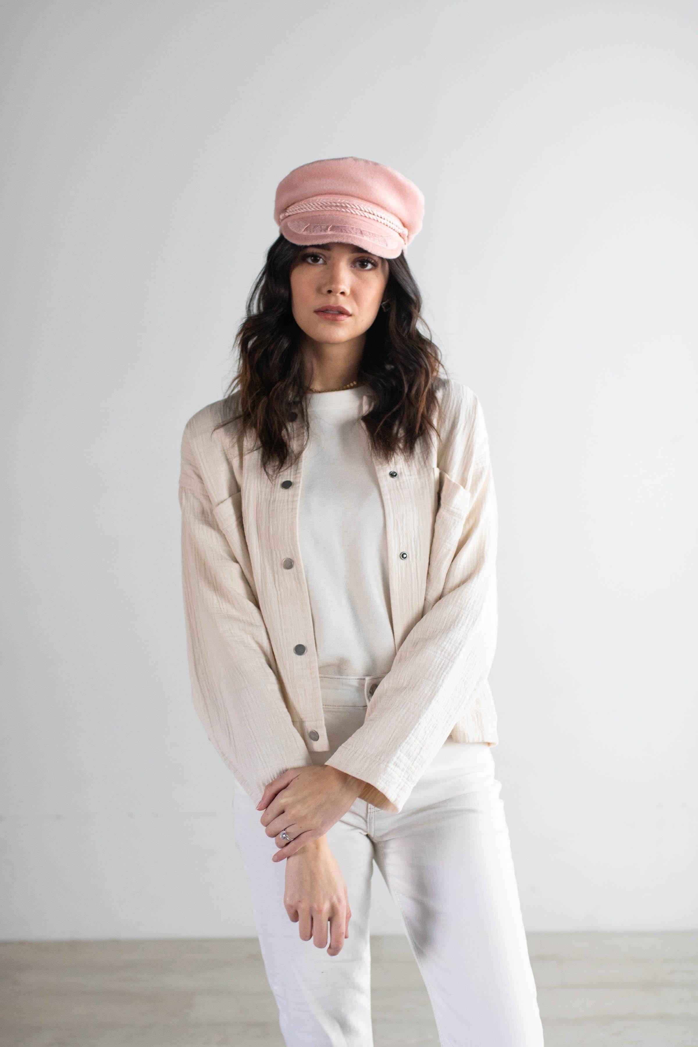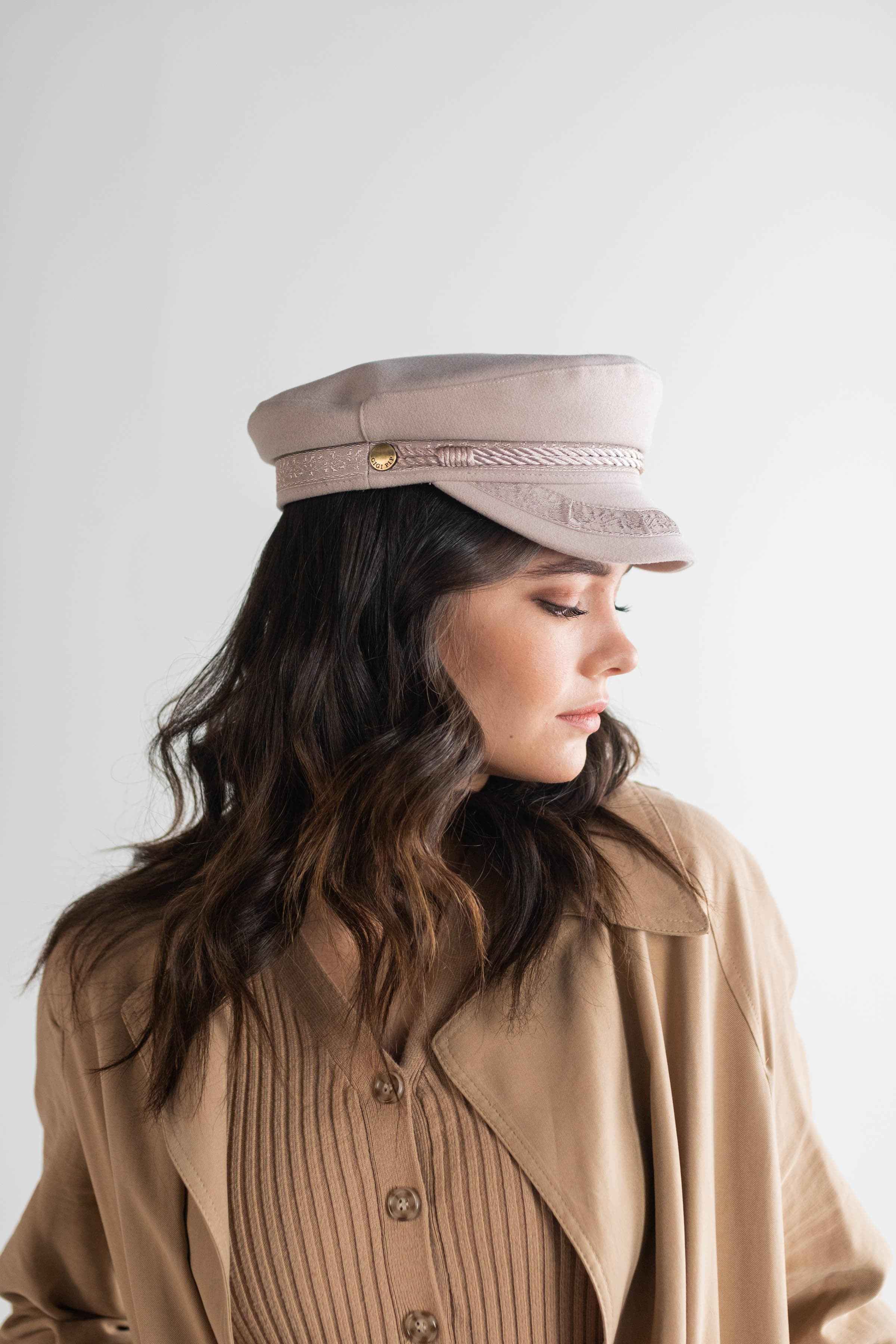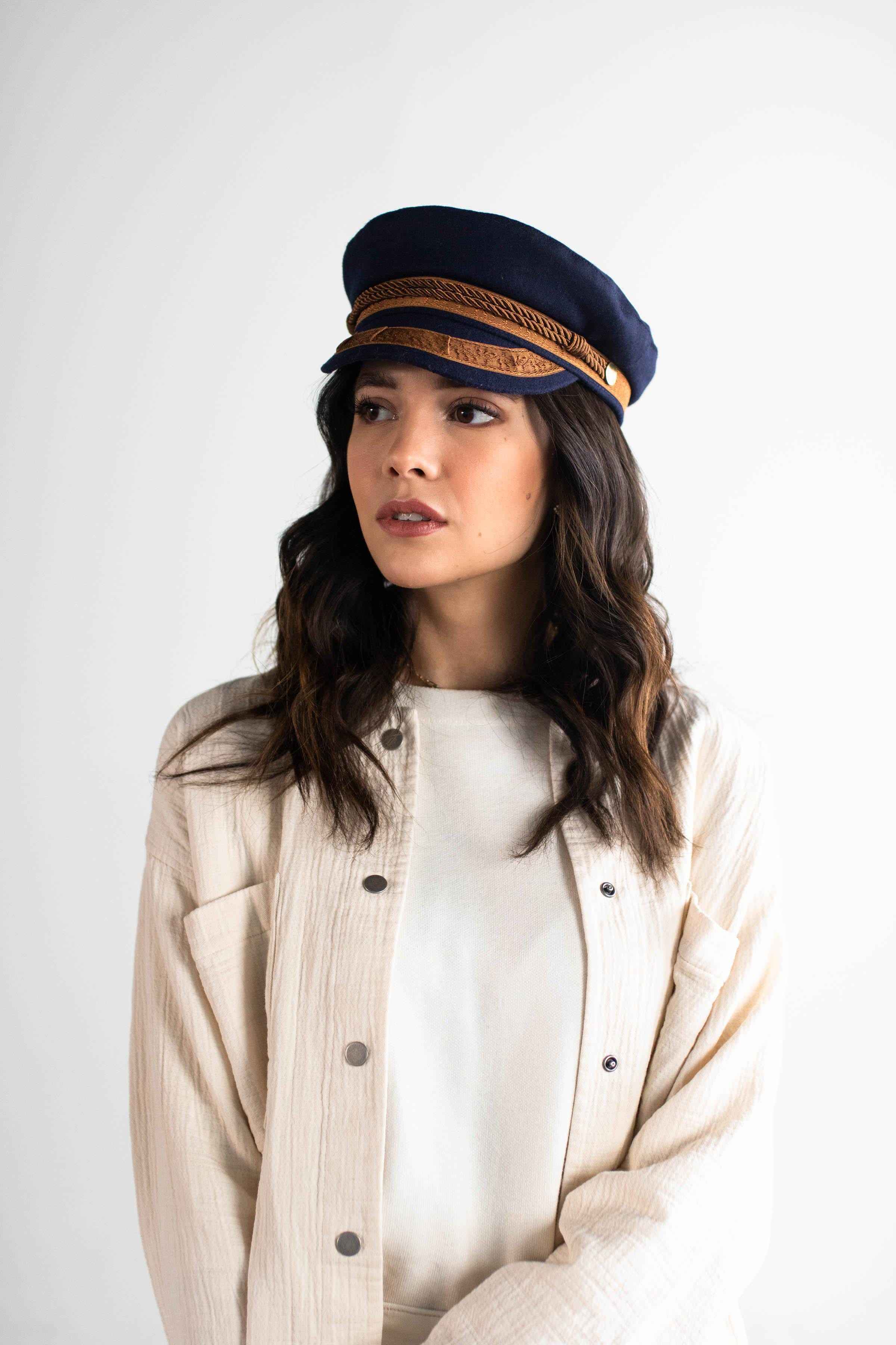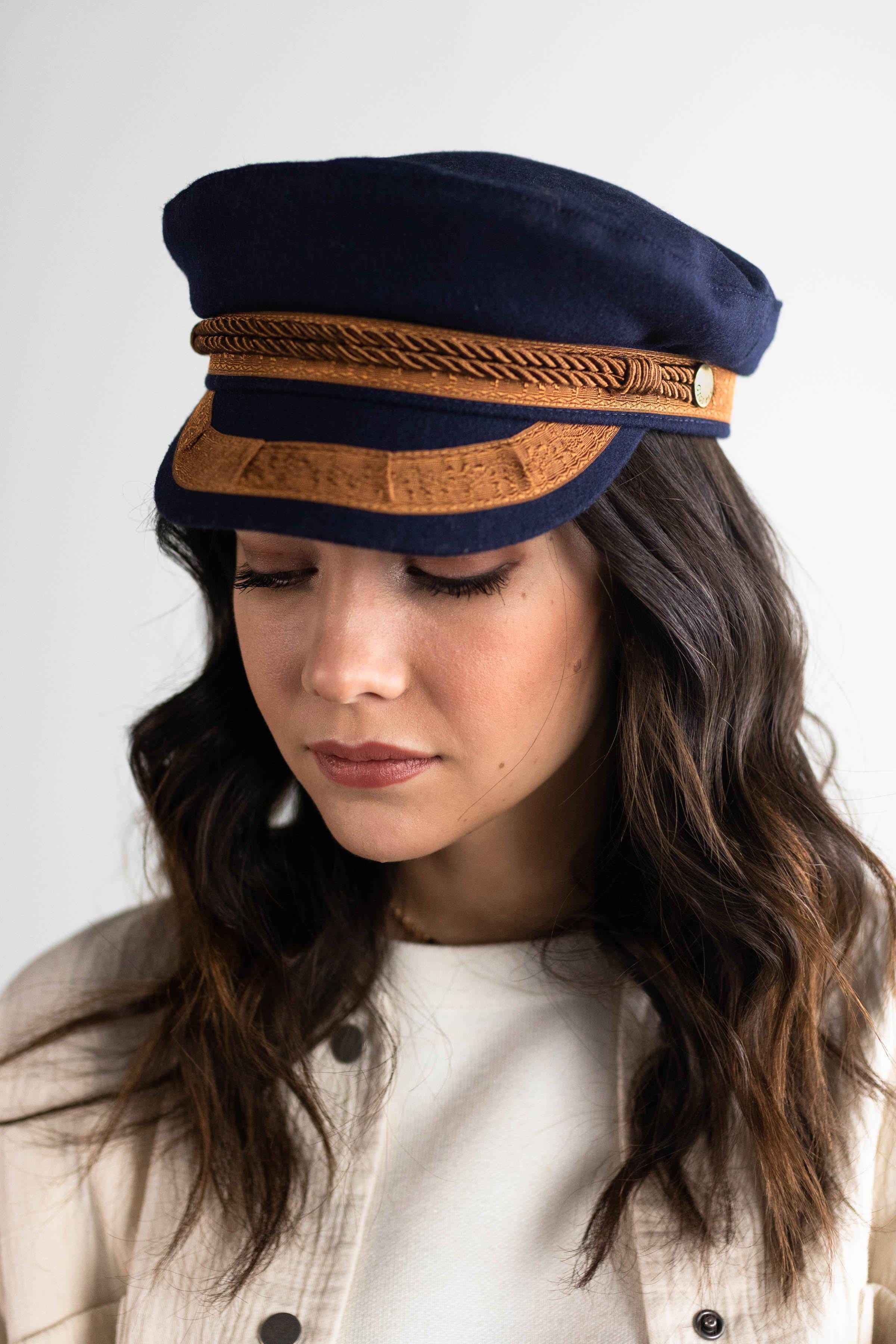 The lieutenant cap is our vintage inspired take on a classic cap style. The lieutenant cap is trimmed with a braided rope, detailed grosgrain and brass button details. The lieutenant cap is 60% polyester and 40% wool with a polyester liner.