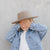 Blemished A taupe colored gamble hat on a plain background #color_taupe Woman wearing a taupe colored gambler hat and a blue shirt and jeans against a plain background #color_taupe