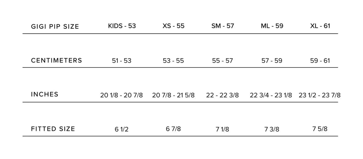 If you feel like you may belong in the "average" head category but still feel unsure, start with our 59 M/L sized hat. It’s designed to fit 59 cm and can be adjusted down to 57 cm by using the Gigi Pip adjustable inner sweatband, pre-installed inside your hat.