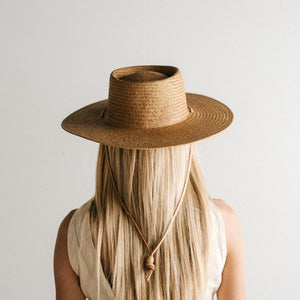 Aiden is a lightweight boater-style straw hat. With a UPF rating of 50+ (excellent) the tightly woven paper straw allows the right amount of sun in while a flat brim provides plenty of shade. Featuring a tonal wooden bead that adjusts the genuine leather chinstrap for the best fit no matter the weather.